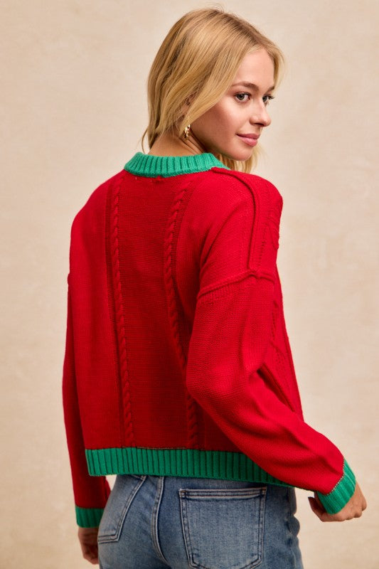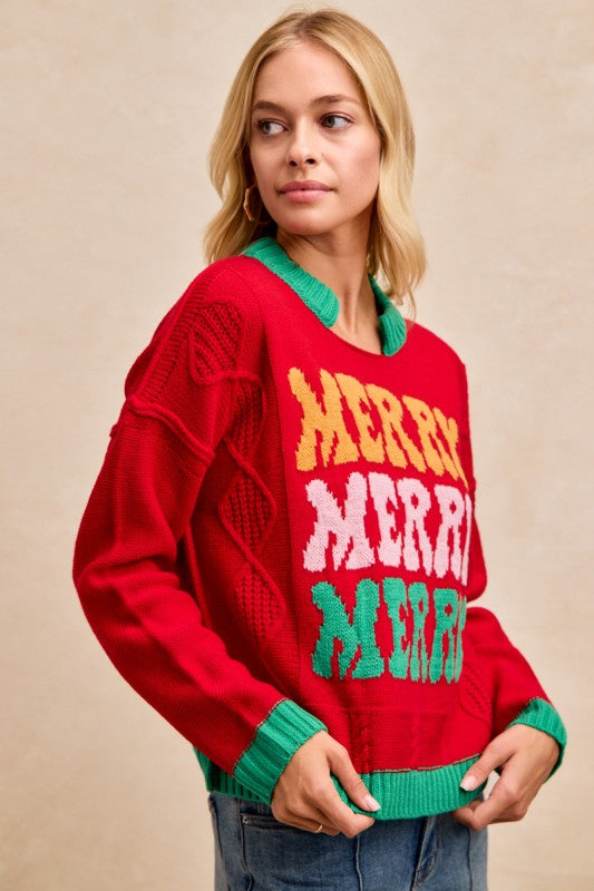 Get into the holiday spirit with our Merry Merry Merry Sweater! 🎄 This cheerful knit is bursting with festive charm — featuring bold, colorful “MERRY” lettering across the front in vibrant shades of gold, pink, and green. The classic red base with contrasting green ribbed trim at the neckline, cuffs, and hem makes it the perfect mix of playful and cozy.