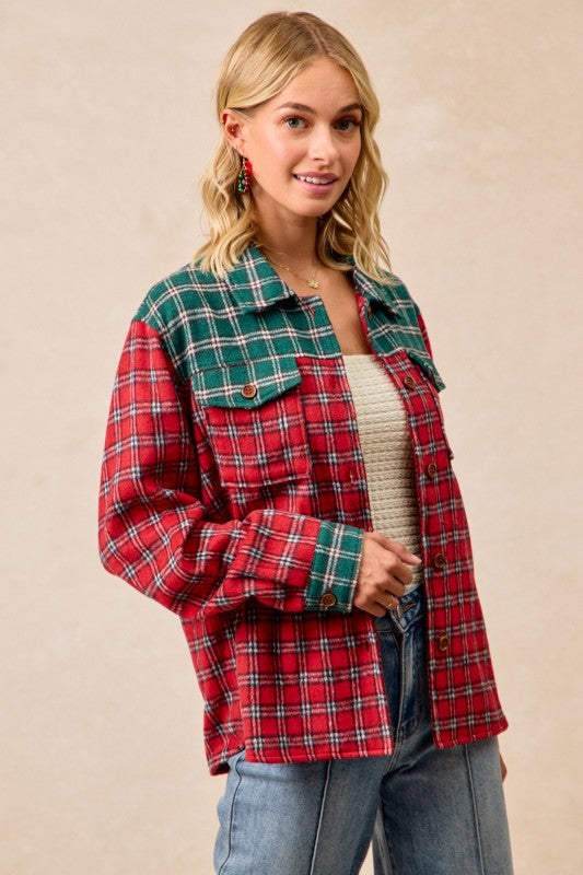 Bring on cozy season with the Holly Tartan Charm Shacket, a festive favorite that’s perfect for layering! This soft flannel-style button-down features a bold red plaid body with contrasting green plaid shoulders and cuffs for a playful holiday touch. Designed with functional chest pockets, button-front closure, and a relaxed fit, this piece easily transitions from casual days to seasonal get-togethers. Pair it with your favorite jeans or leggings for an effortlessly stylish look that feels merry and bright all season long.