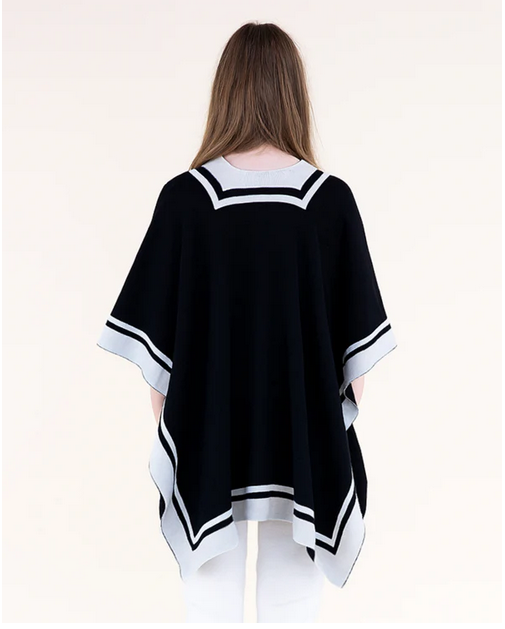 Elevate your layering game with this chic reversible black and ivory wrap. Designed with clean lines and timeless contrast trim, this elegant ruana offers two looks in one — flip it inside out for an instant outfit refresh. The soft, mid-weight knit drapes effortlessly over your shoulders, making it the perfect finishing touch for any season.