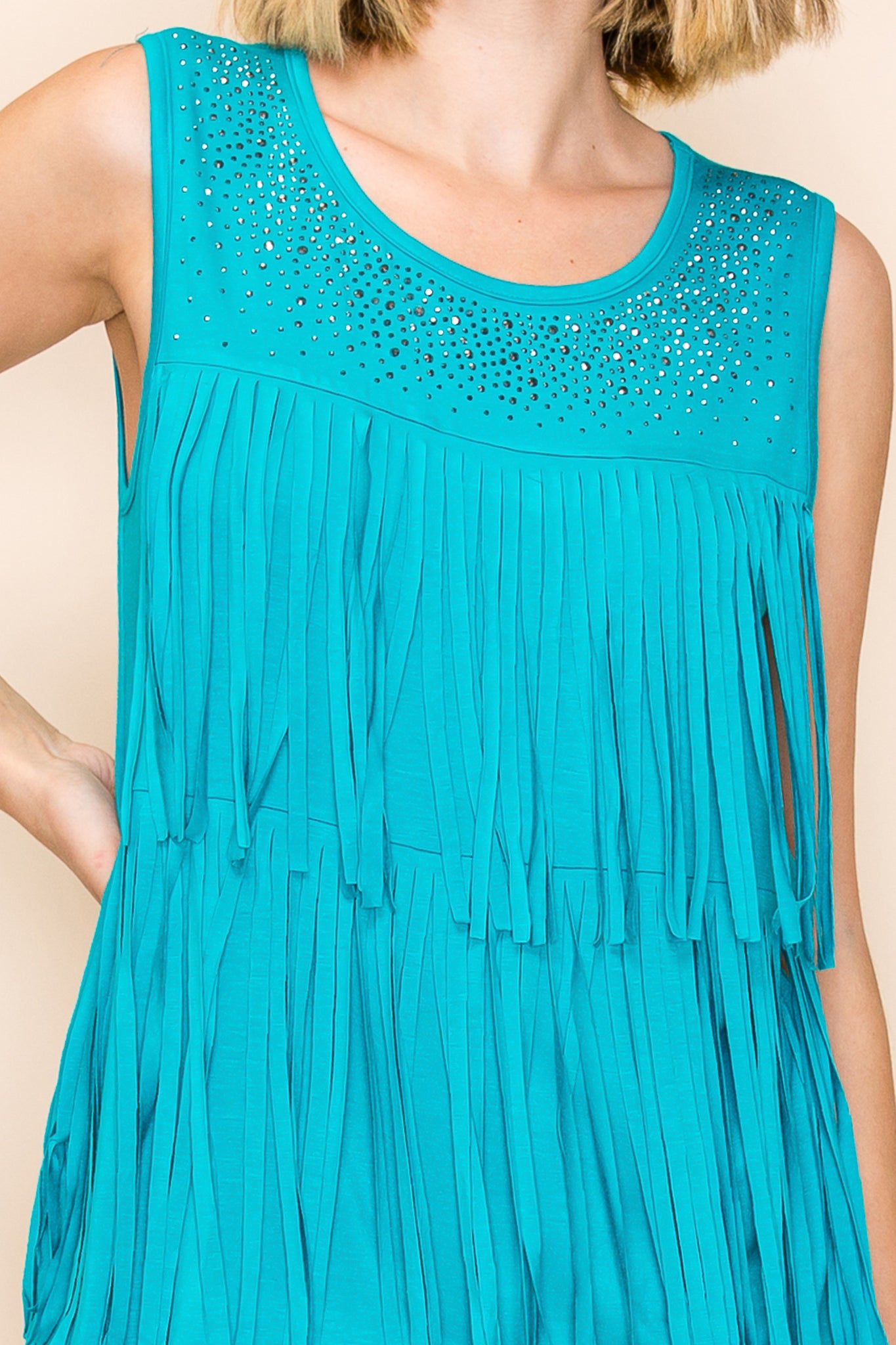 Turn heads from rodeo nights to summer concerts in this bold beauty 💚 This statement tank features shimmering stud details across the neckline and layers of playful fringe that move with every step.