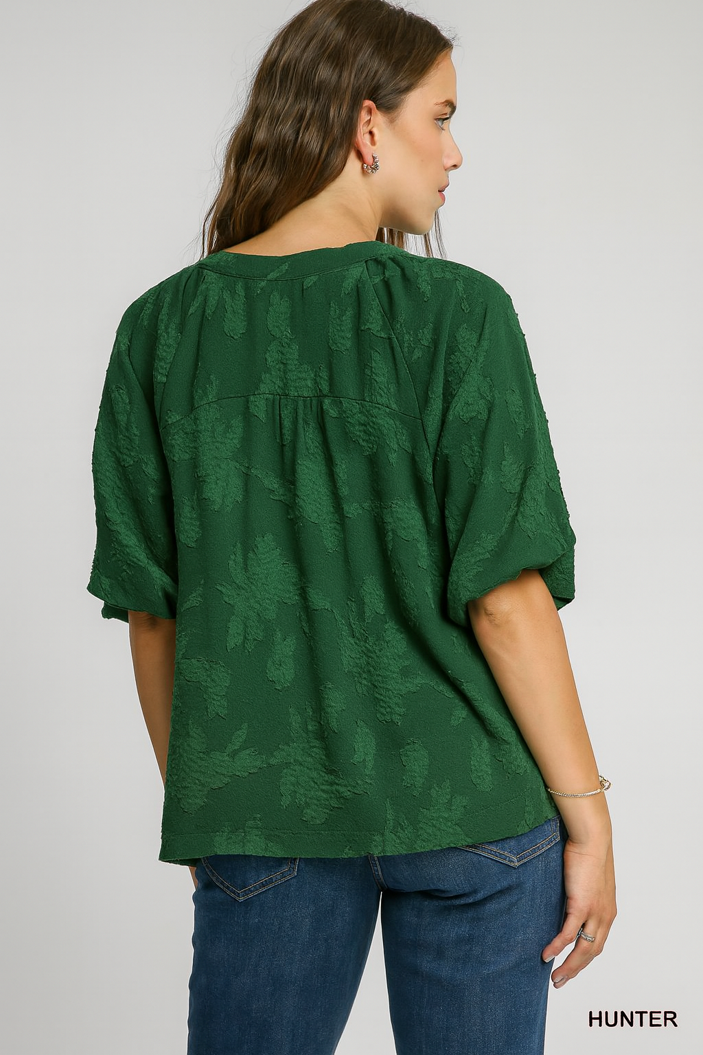 Bring effortless charm to your everyday wardrobe with this beautifully textured floral blouse. Designed in a rich hunter green, this top features a soft woven fabric with raised floral detailing that adds depth and elegance to every angle. The relaxed fit drapes comfortably, while the subtle gathers along the neckline create a flattering silhouette. Finished with elbow-length puff sleeves and a lightweight feel, it’s the perfect go-to piece for work, weekends, and everything in between.