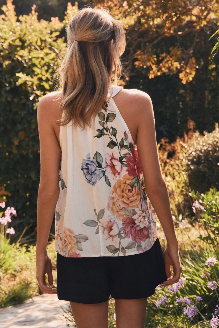 This halter-style floral top is giving all the romantic garden vibes. With its soft ivory base and bold, painterly blooms in rich reds, blush, golden mustard, and soft blue, it’s the perfect piece to transition from summer into fall.