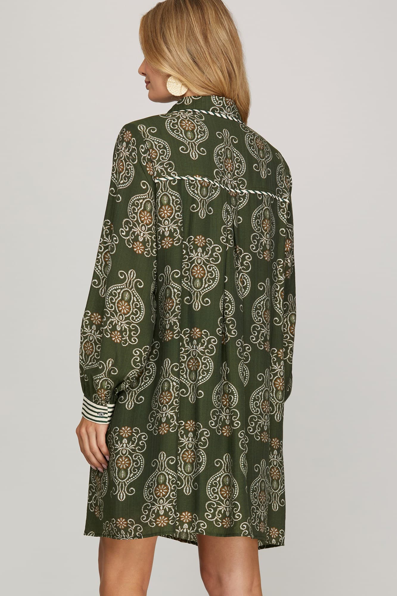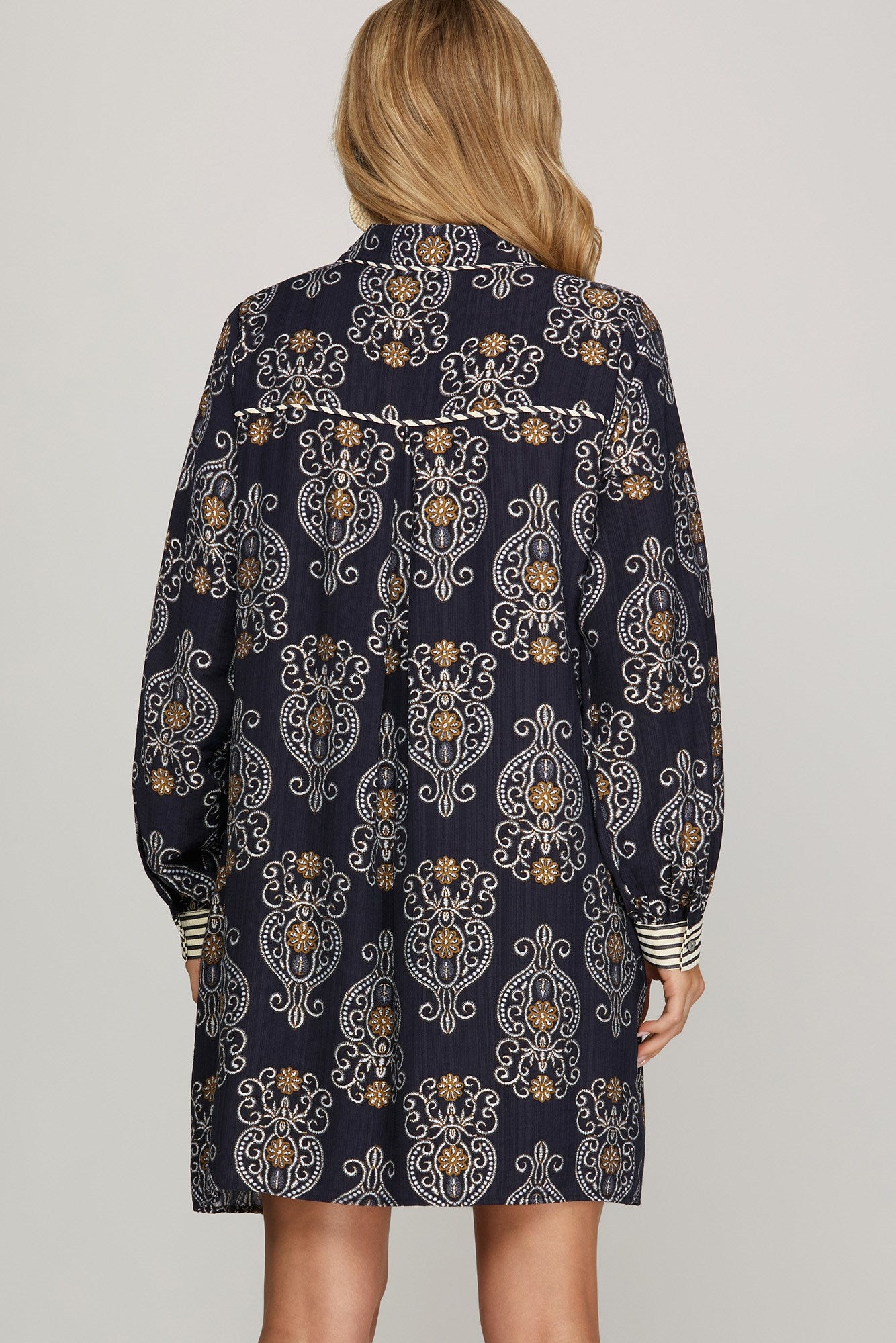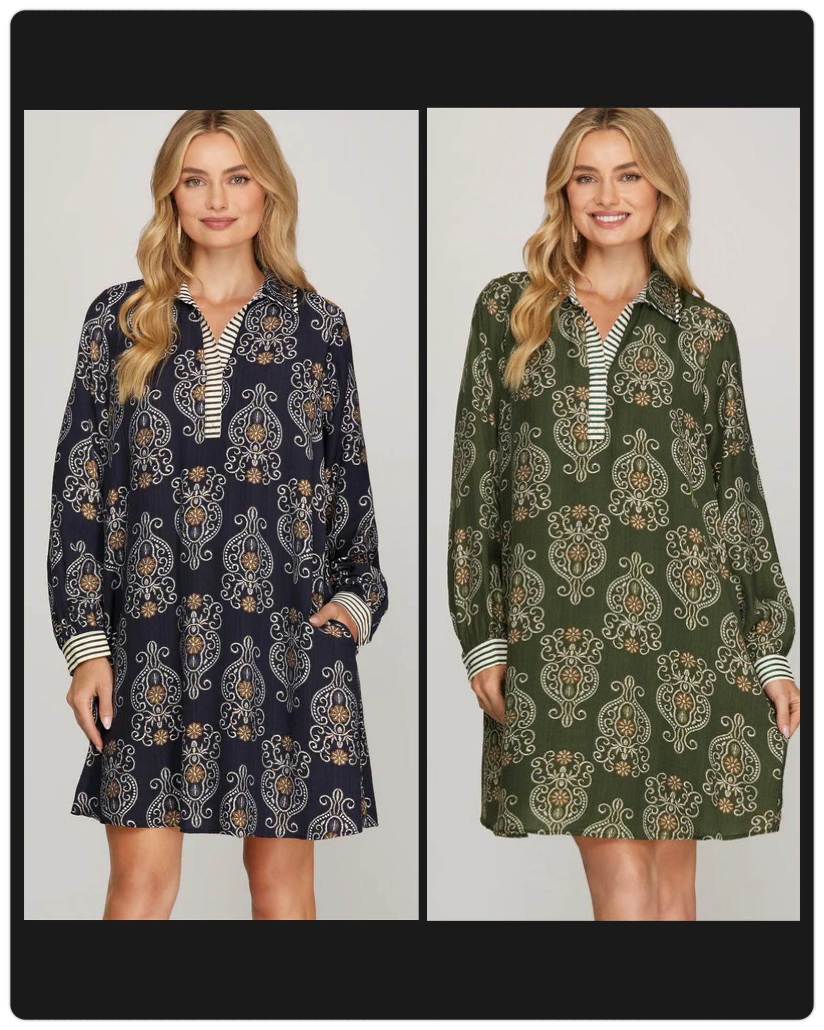 Effortlessly chic with a touch of global charm, the Sandara Paisley Tunic Dress is a wardrobe must-have for any season. Featuring a bold patterned design with striped trim detailing at the collar and cuffs, this dress offers a stylish balance of casual sophistication. The relaxed silhouette and side pockets make it as comfortable as it is flattering — perfect for brunches, vacations, or an easy day out.