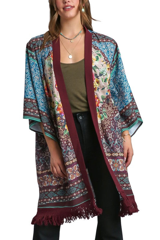 Turn heads in this vibrant, boho-chic kimono, a statement layering piece that brings color and charm to any outfit. Crafted from silky lightweight fabric, it features a beautiful patchwork of floral and geometric prints in shades of teal, navy, and taupe. The open-front design drapes effortlessly over tanks, tees, or dresses, while the wide sleeves and tasseled hemline add a breezy, free-spirited finish.