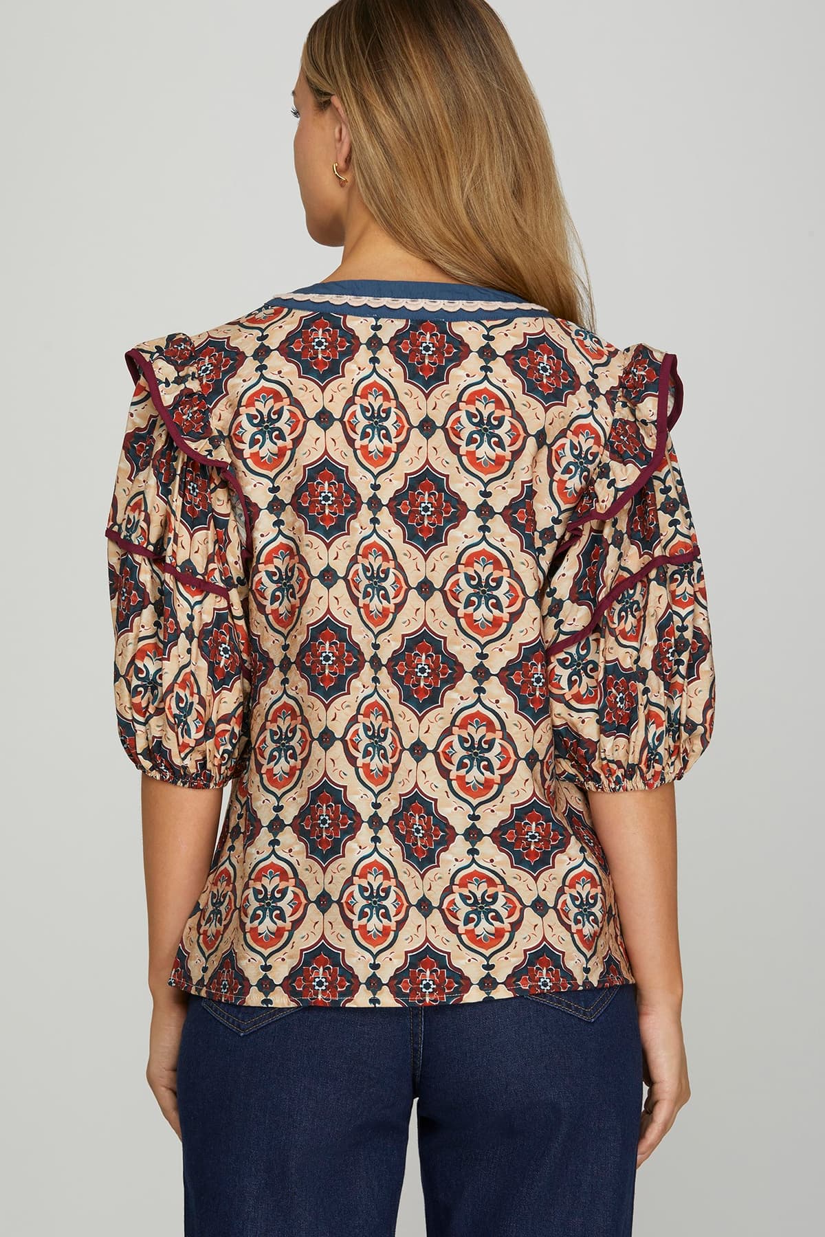 Meet your new statement top for fall! This stunning mixed-print blouse features a beautiful medallion tile pattern in rich shades of rust, navy, and cream. The notched neckline with contrast denim-blue trim and delicate lace detailing adds a feminine touch, while the ruffled shoulders and puff sleeves bring soft volume and charm. Designed with an easy, relaxed fit and elastic cuffs for comfort, this piece pairs effortlessly with denim or trousers for a polished yet playful look.