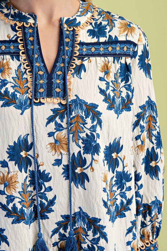 ~ Floral Fall Print~ 3/4 Length Sleeve~ Decorative Trim Details~ Tassel Neck TieFabric: 83% Rayon, 17% NylonLabel: Gigio