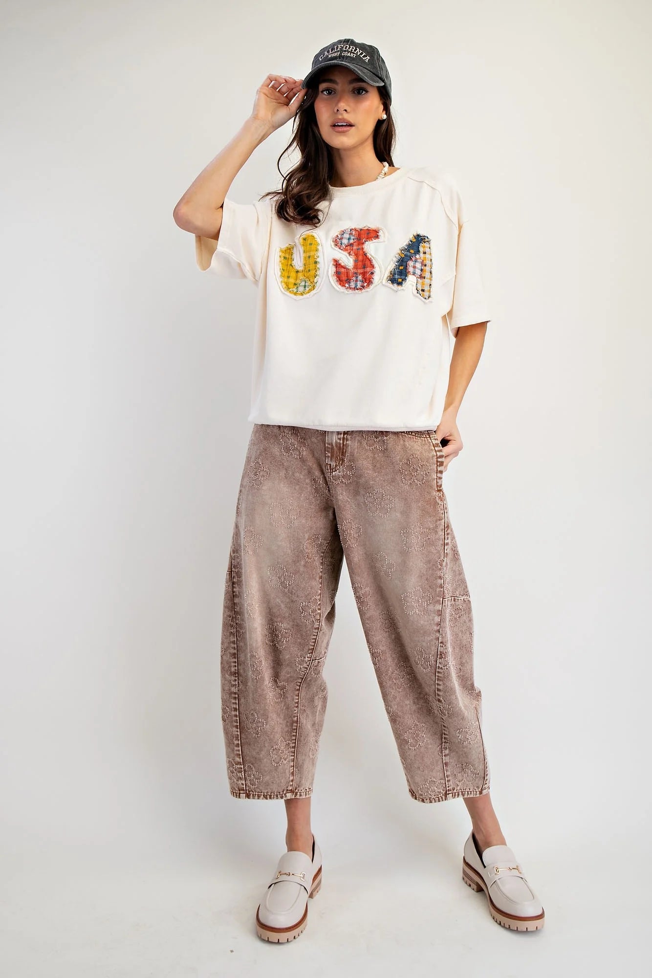 Featuring textured patchwork “USA” lettering in mixed prints, this top has a relaxed silhouette that’s easy, effortless, and full of personality. The soft fabric and casual fit make it perfect for everyday wear, whether you’re heading to a summer festival, running errands, or lounging in style.