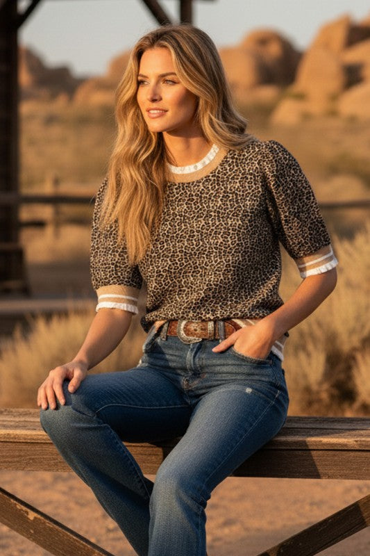 Leopard knit short sleeve top featuring a lightweight, soft stretch fabric with a relaxed everyday fit. Finished with subtle contrast banded trim for an elevated, wearable look.