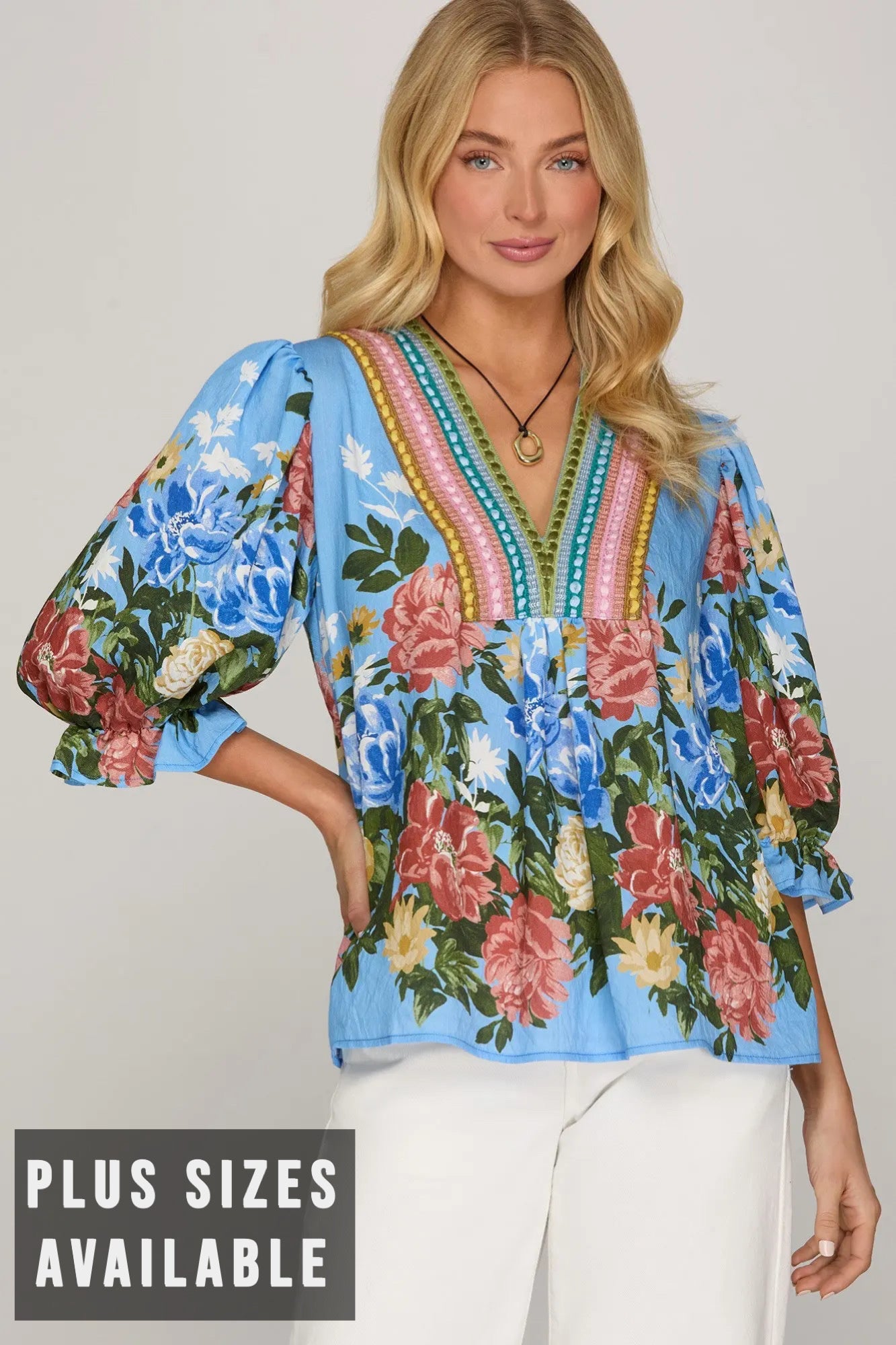 Bright, feminine, and effortlessly charming, this floral puff sleeve top is a true standout. Designed with a flattering V-neckline accented by vibrant multicolor trim, it adds eye-catching detail that elevates the entire look.