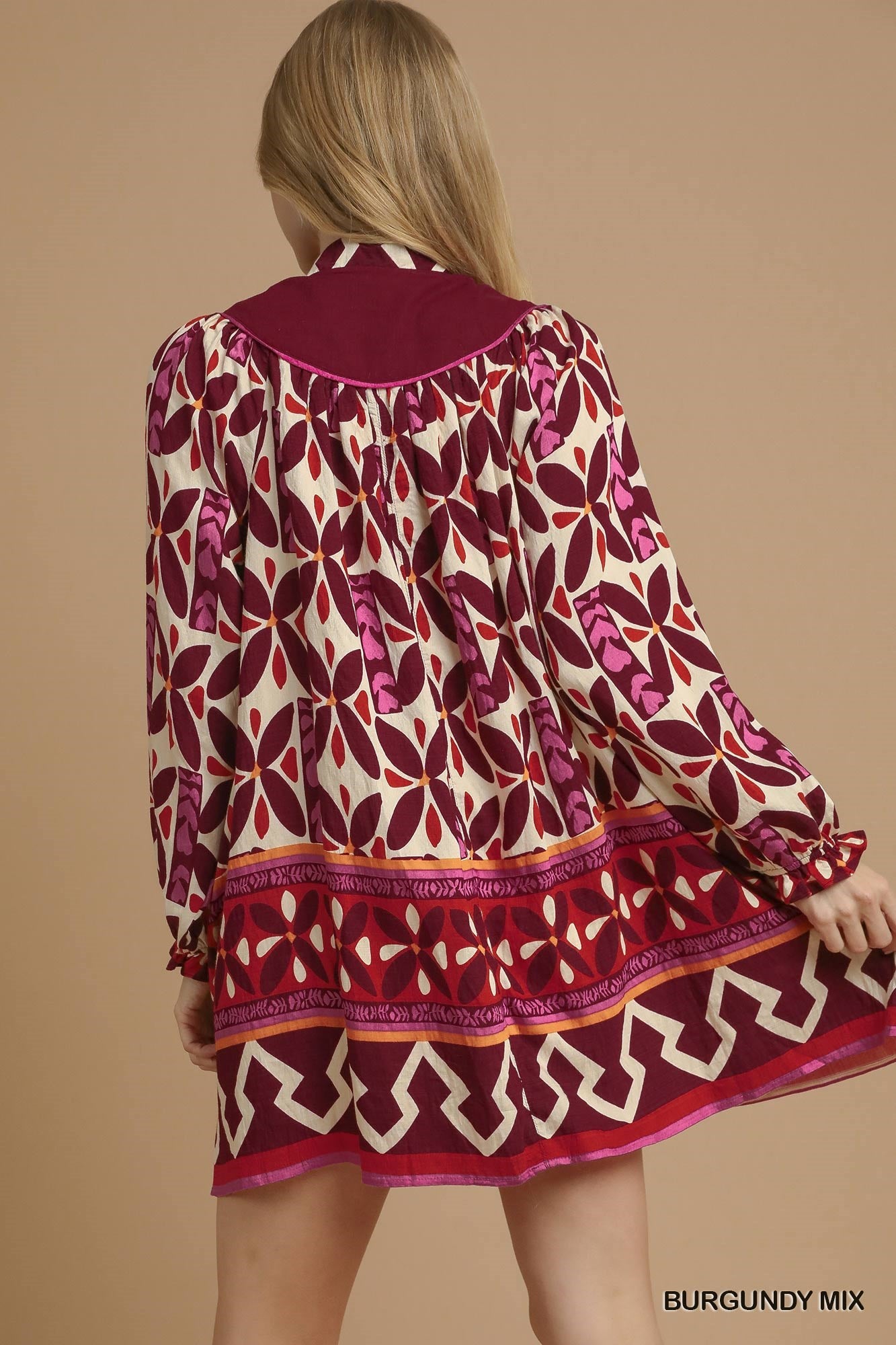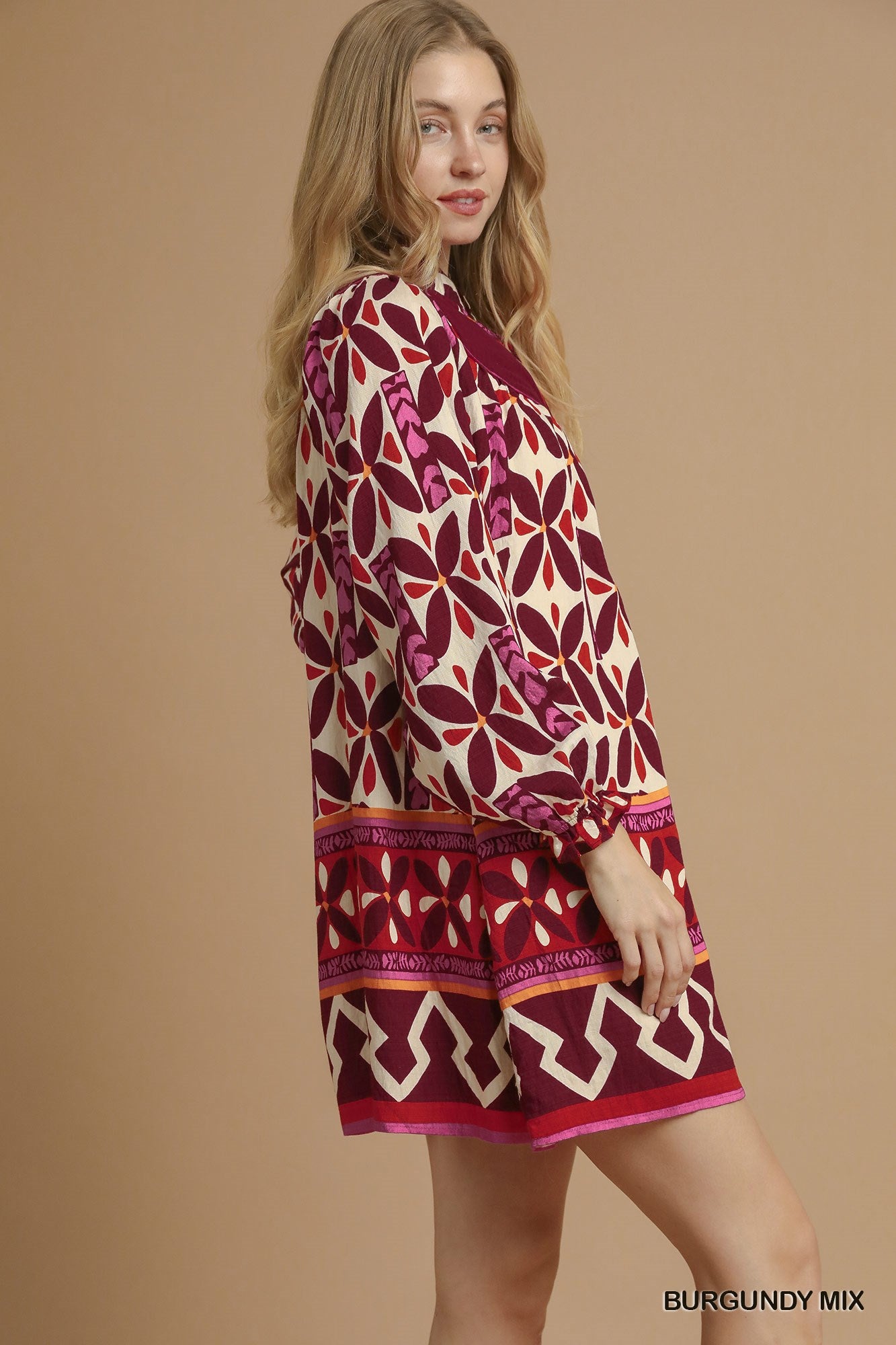 Bold, beautiful, and effortlessly wearable, this burgundy mix shift dress is a standout piece for any season. Featuring a rich, eye-catching print with coordinating border details, this dress is designed with a relaxed silhouette that flatters while keeping you comfortable. The split neckline with button detail and long sleeves add just the right touch of polish.