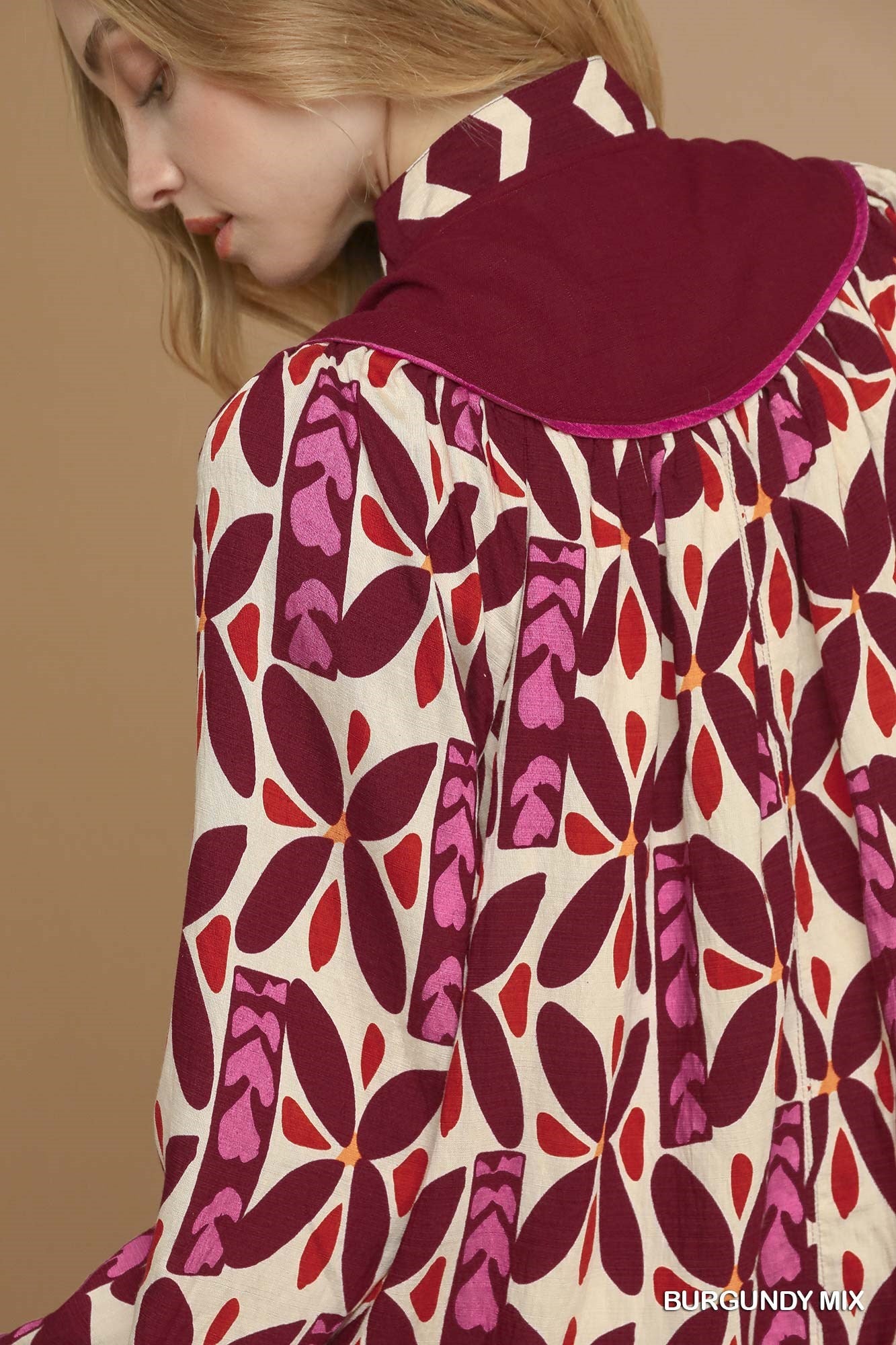 • Burgundy mix print with contrast border accents
