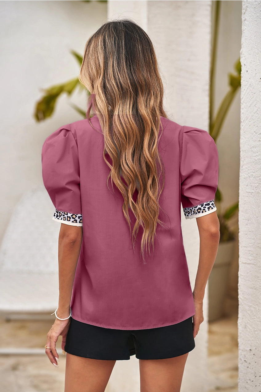 Add a touch of fierce femininity to your wardrobe with this stunning mauve puff-sleeve top. The soft woven fabric pairs beautifully with its bold leopard-trim neckline and sleeve cuffs, giving you a chic contrast that’s both classic and playful. The split V-neck with ivory accent trim adds sophistication, while the structured puff sleeves bring just the right amount of volume.