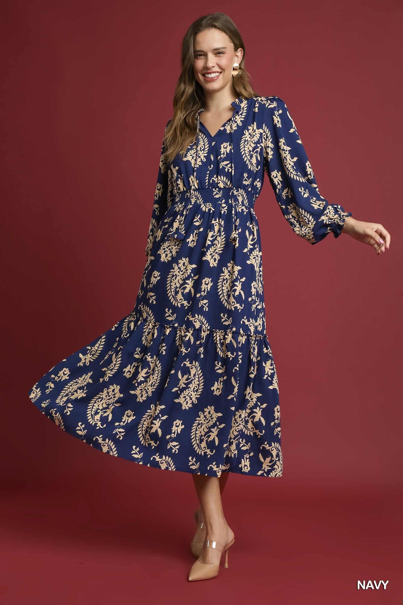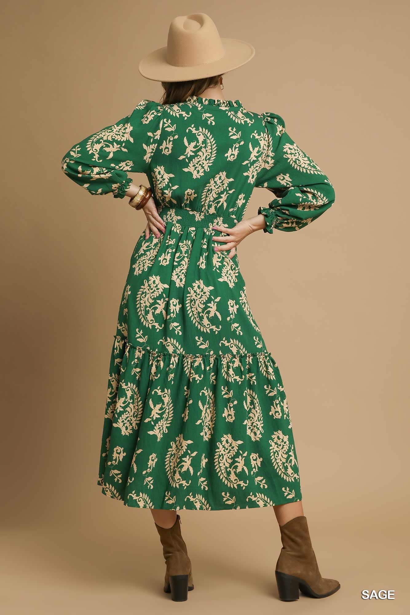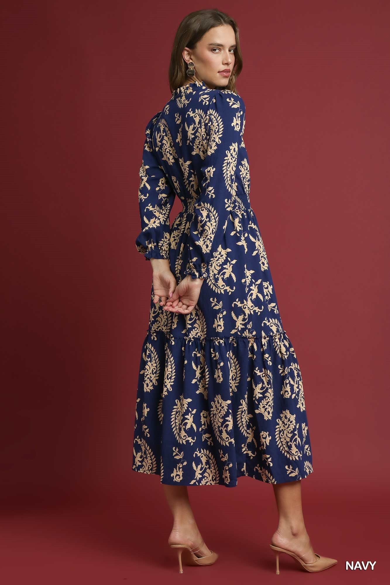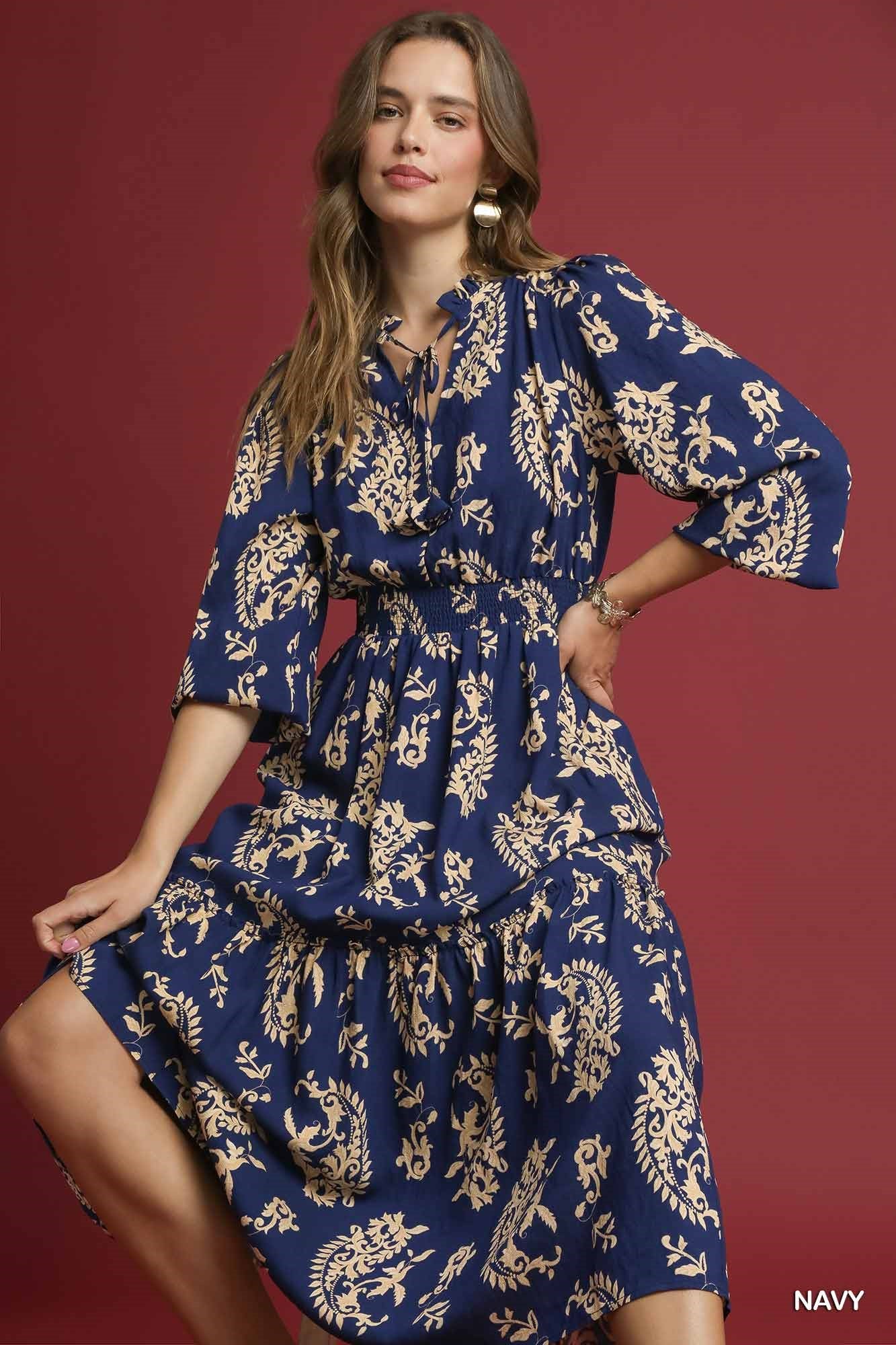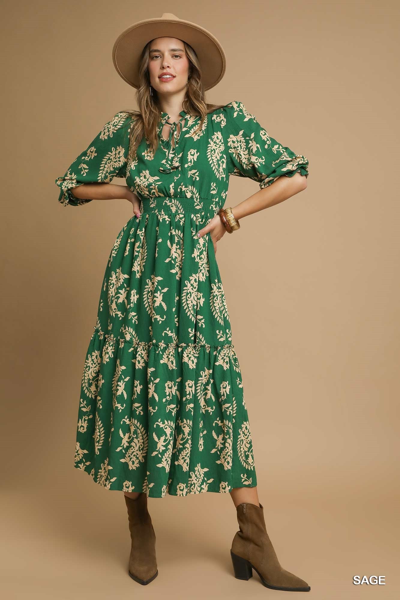 This effortlessly feminine midi dress features a timeless botanical print that feels both classic and fresh. Designed with a flattering elastic waistband, it cinches gently at the waist while allowing for comfortable, all-day wear. The flowy skirt adds beautiful movement, making it perfect for everything from casual days to dressed-up occasions.