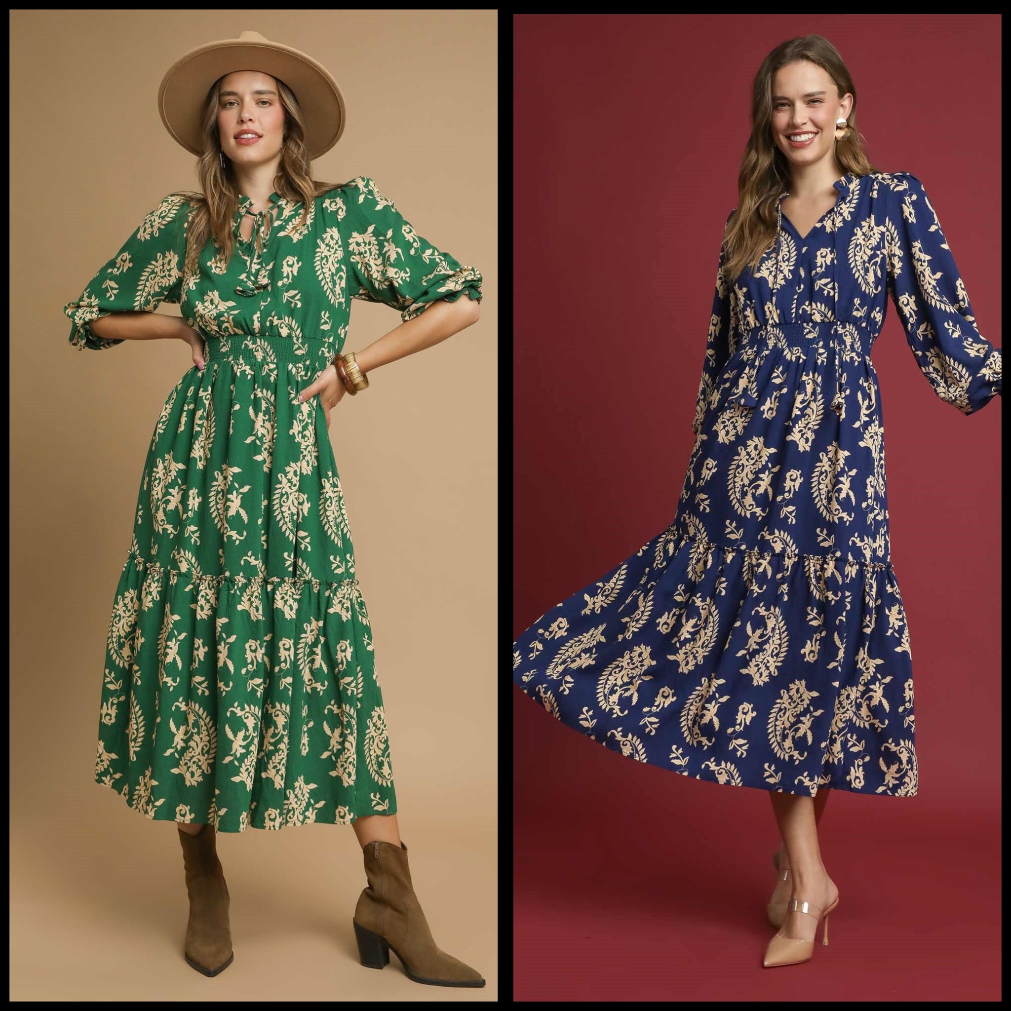 Available in sage and navy, this versatile piece pairs beautifully with boots, wedges, or sandals depending on the season.