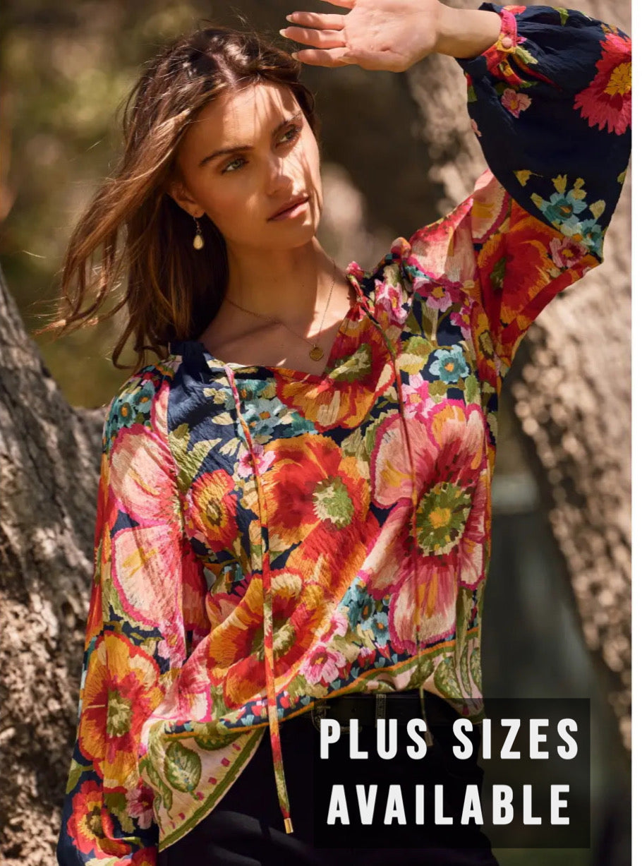 Bold, romantic, and effortlessly elevated — the Midnight Garden Statement Blouse is designed to turn heads. Featuring an artistic floral print in rich shades of crimson, coral, golden yellow, and deep navy, this blouse brings dramatic color and movement to your wardrobe.