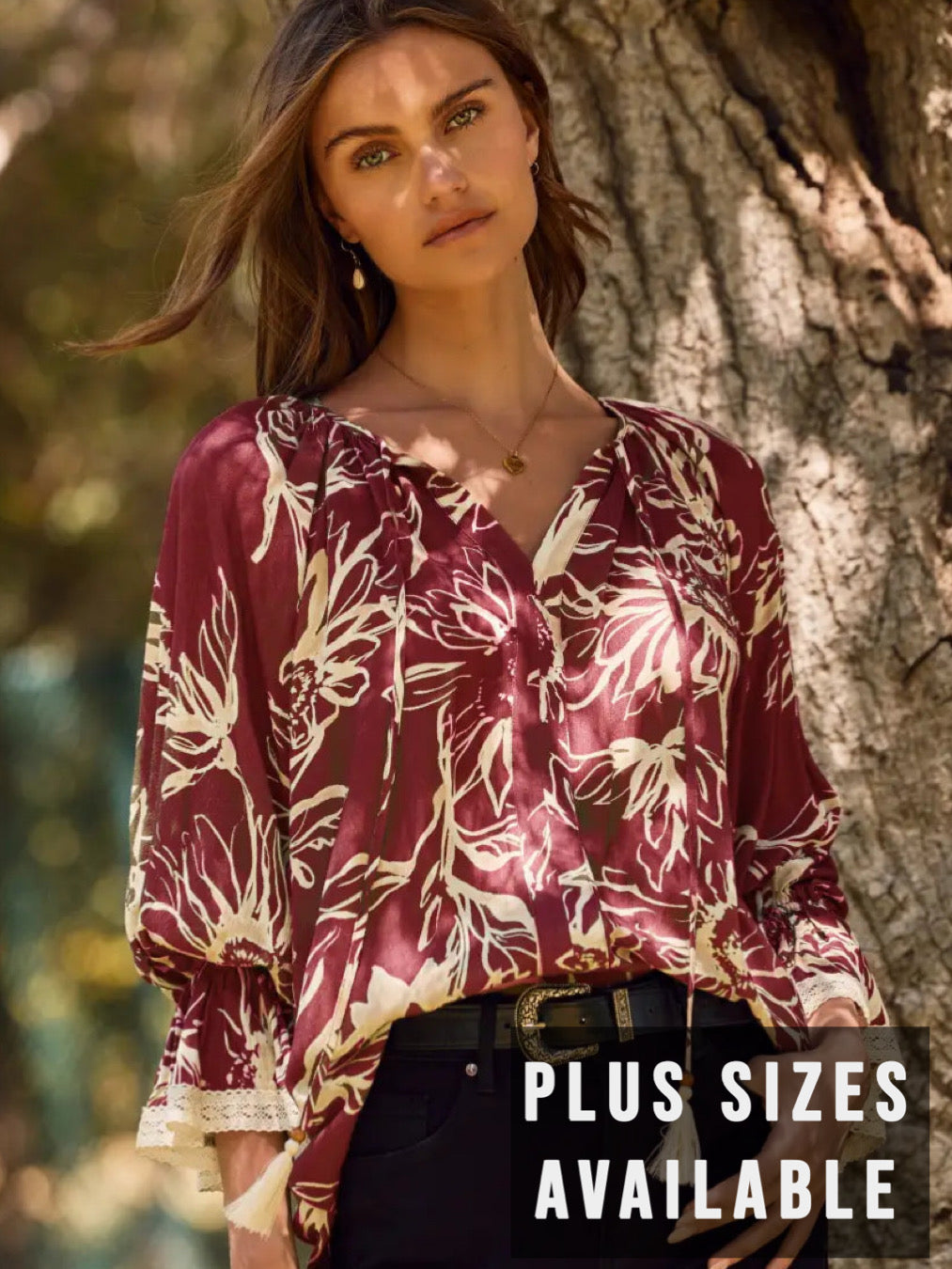 Romantic, rich, and effortlessly feminine — the Burgundy Bloom Tassel Blouse is a standout piece for fall and beyond. Designed in a deep burgundy hue with soft ivory floral print, this blouse brings warmth and elegance to any look.