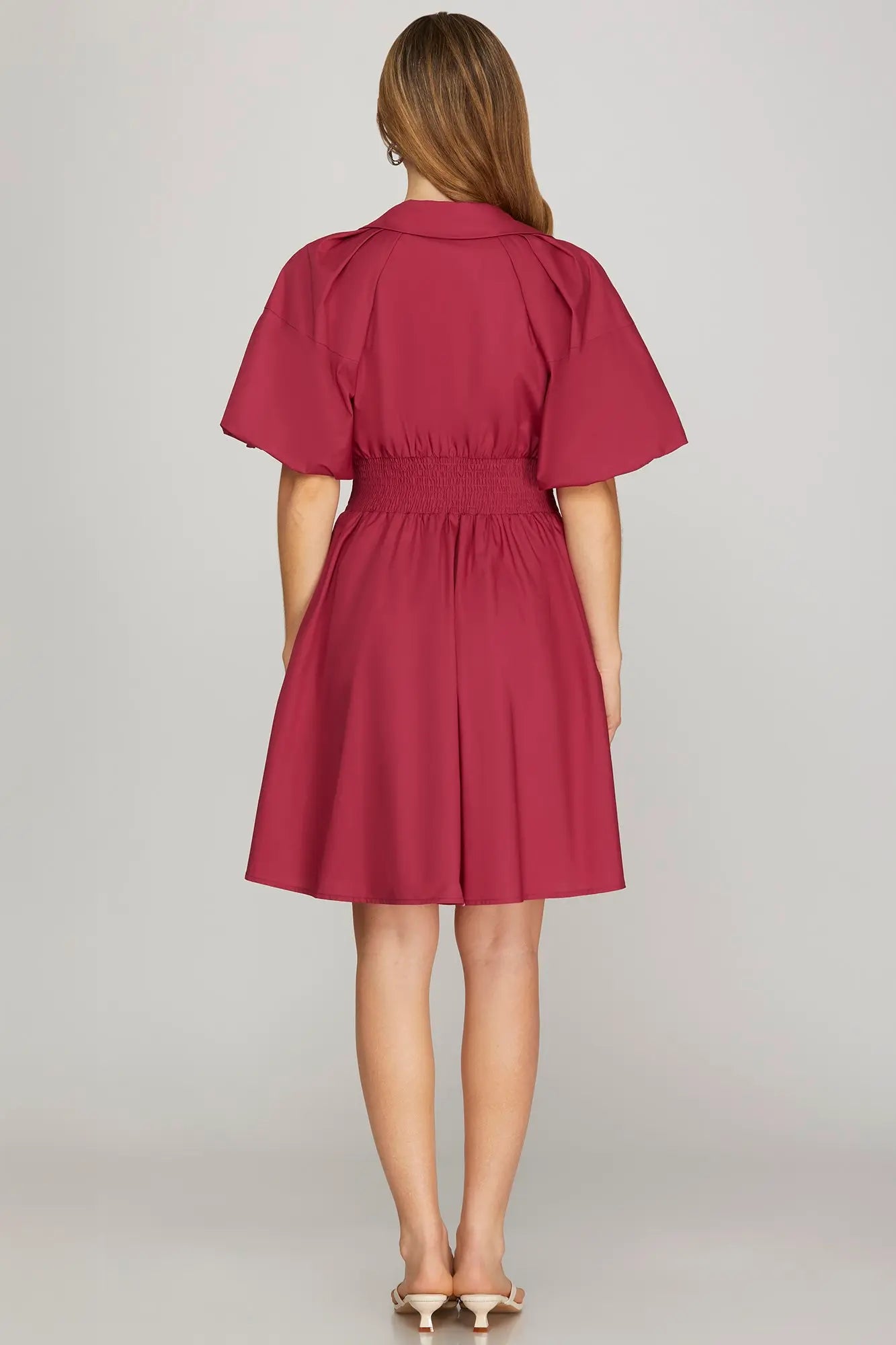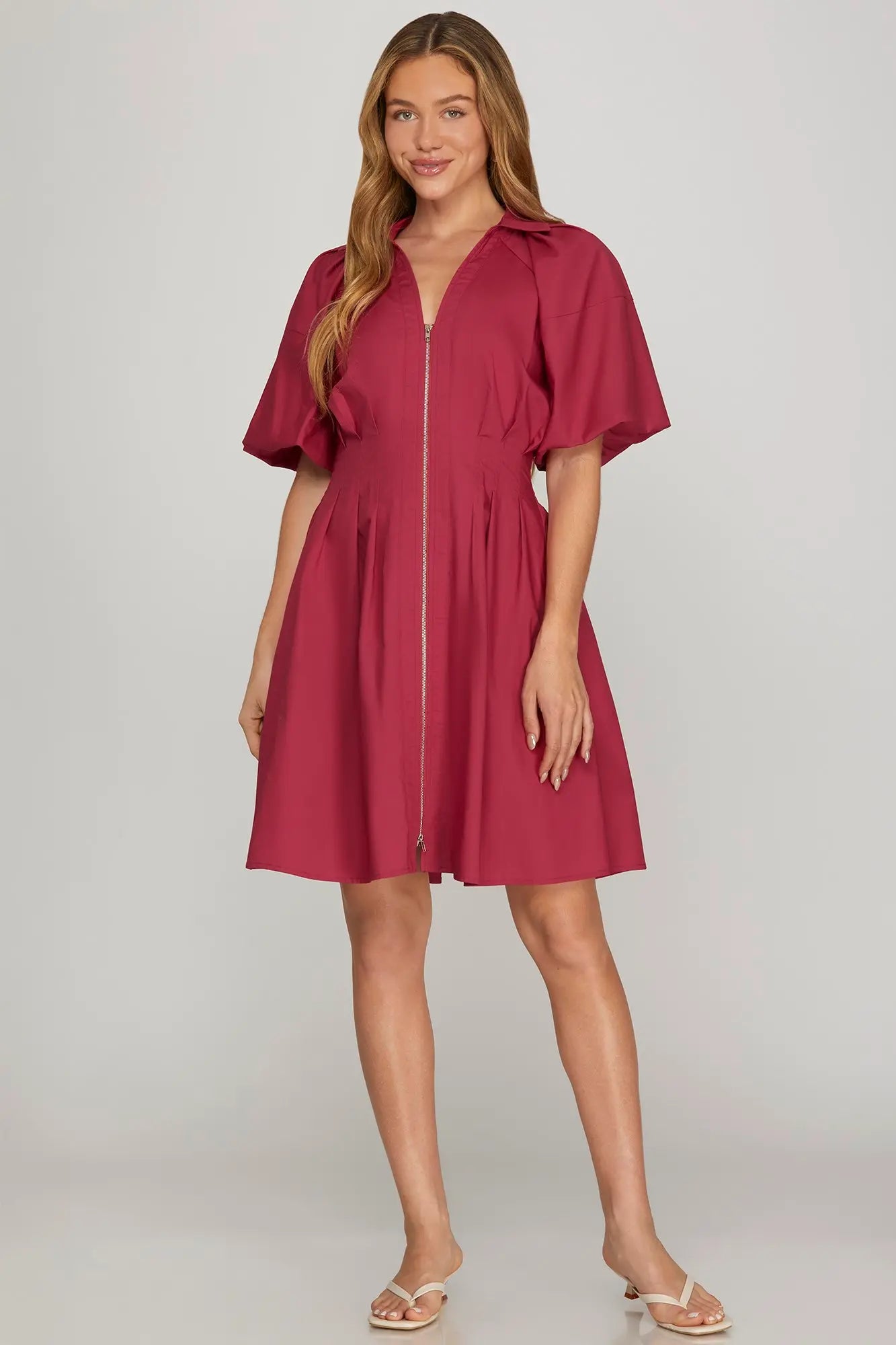 Effortless polish meets everyday ease in this must-have zip-front dress. Designed in a rich wine hue, this flattering silhouette features a partial front zipper with a soft collared neckline and beautifully tailored seaming that defines the waist. The relaxed flutter sleeves add a feminine touch while keeping it comfortable and breathable. Dress it up with wedges or keep it casual with sandals—this one does it all.