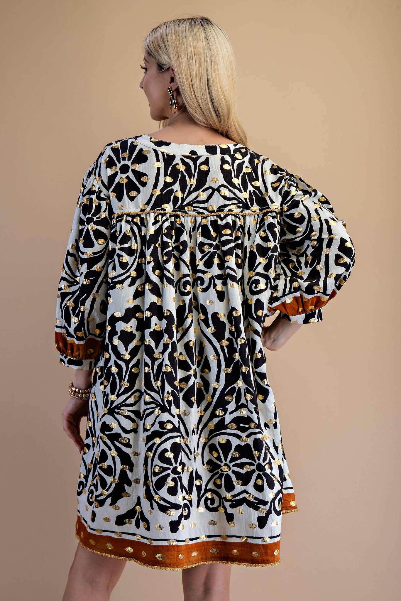Bold, breezy, and beautifully unique—this boho-inspired dress makes a statement the moment you slip it on. Featuring an intricate black-and-gold abstract floral print against a soft neutral base, this dress is elevated with rich copper contrast trim on the sleeves and hem. The relaxed silhouette drapes comfortably while still offering shape, and the tie neckline adds a feminine, detailed touch.