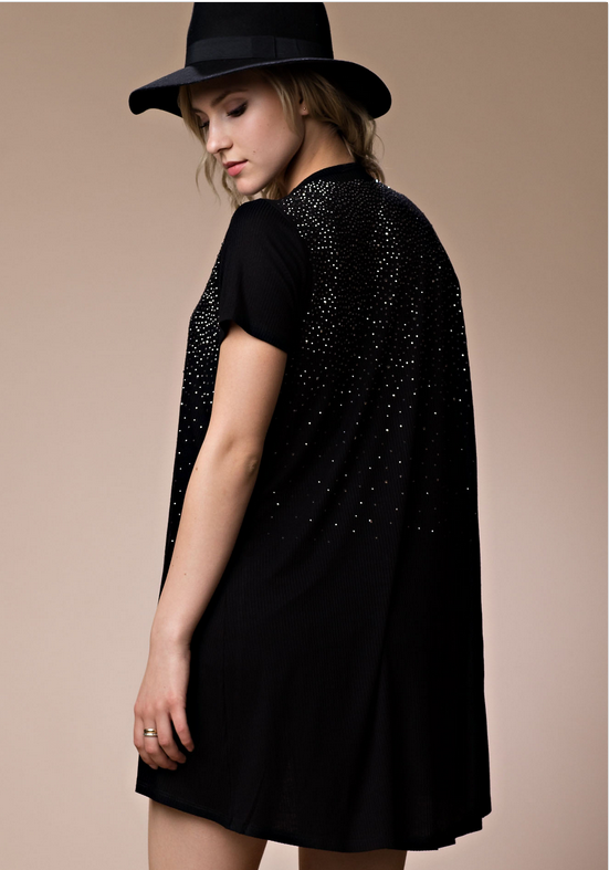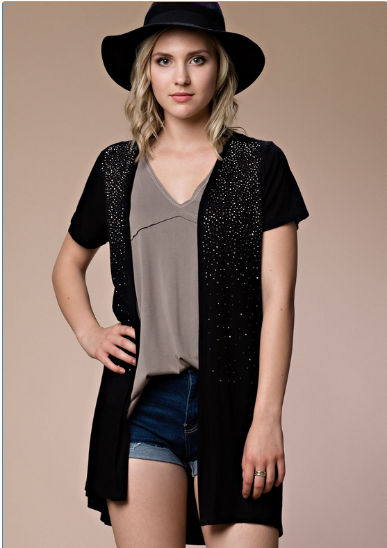 Add instant edge and effortless glam to any outfit with this statement layering piece. Designed in classic black, this open-front duster vest features shimmering stud embellishments along the front that catch the light beautifully. The lightweight, drapey fit makes it perfect for layering over tanks, tees, or dresses, while the longer length creates a flattering, elongating silhouette. Dress it up for a night out or throw it on with denim for everyday chic.